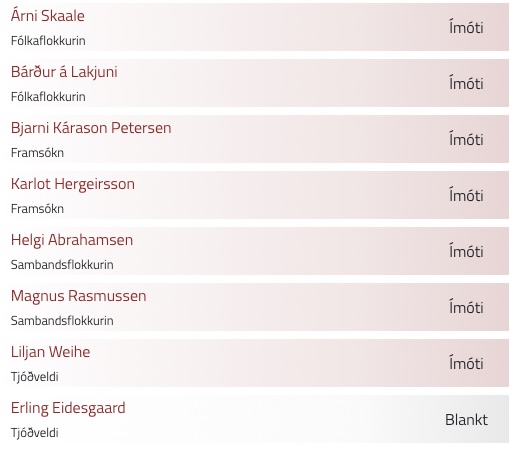 Bjarni Kárason Petersen og Karlot Hergeirsson úr Framsókn atkvøddu ímóti. Tað gjørdi Liljan Weihe úr Tjóðveldi eisini. Erling Eidesgaard úr Tjóðveldi atkvøddi blankt.
