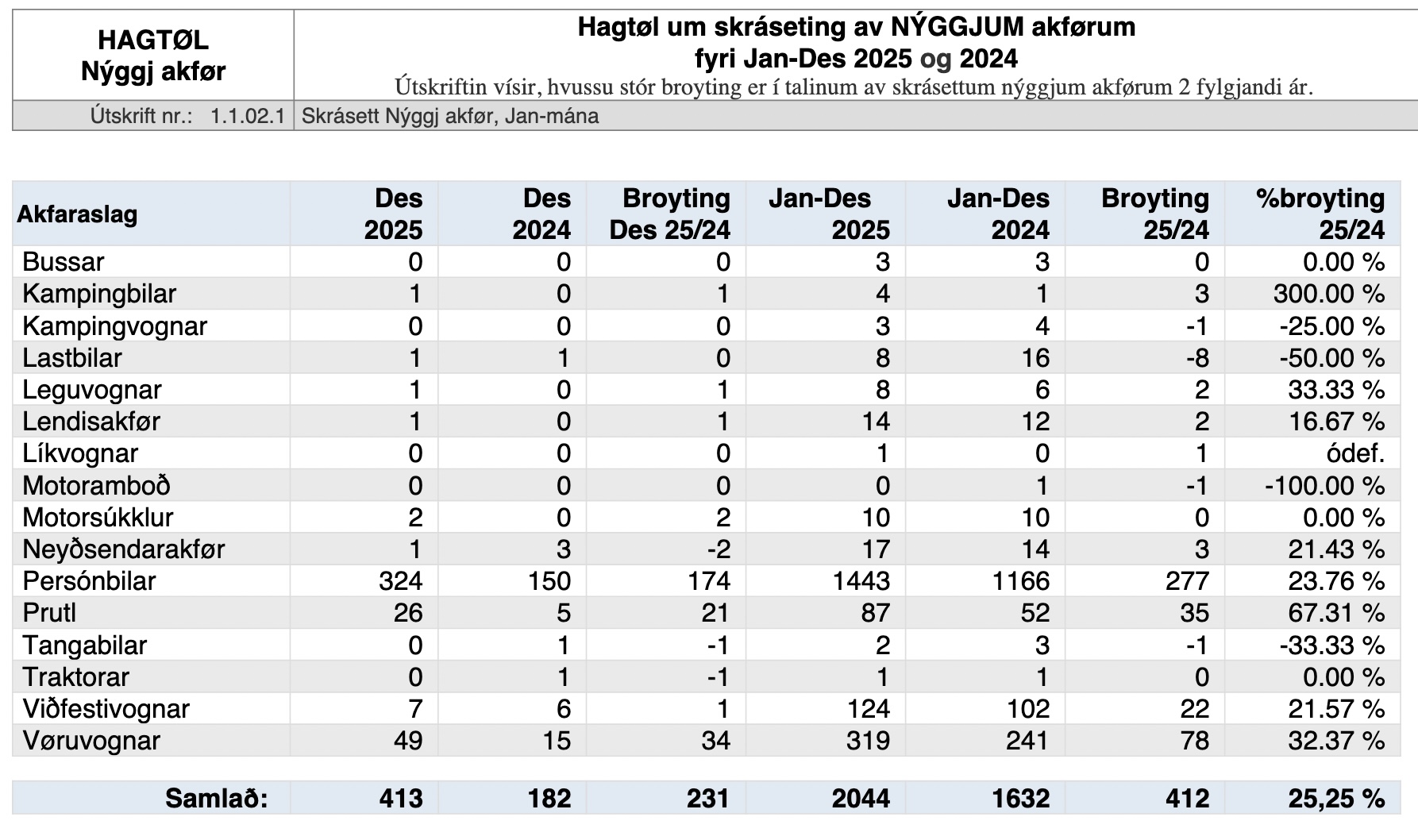 Tað hevur verið framgongd í bilasøluni í Føroyum seinasta árið. Tað sæst aftur, nú Akstovan hevur gjørt upp hagtølini fyri 2025.