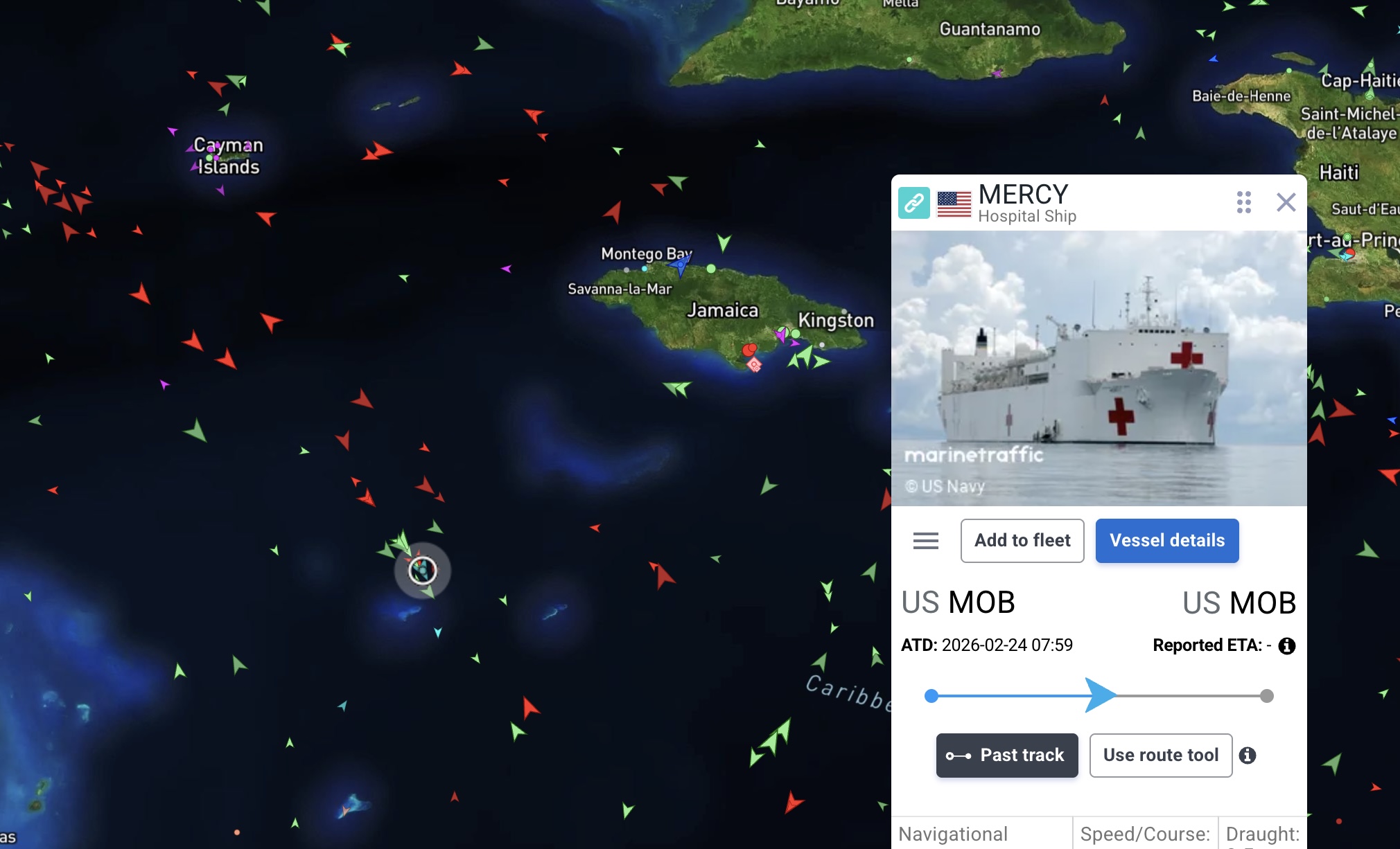 Sambært Marinetraffic.com er Mercy í løtuni í Karibiska havinum í ein útsynning úr Jamaica og siglir í ein landssynning við 10 míla ferð.
