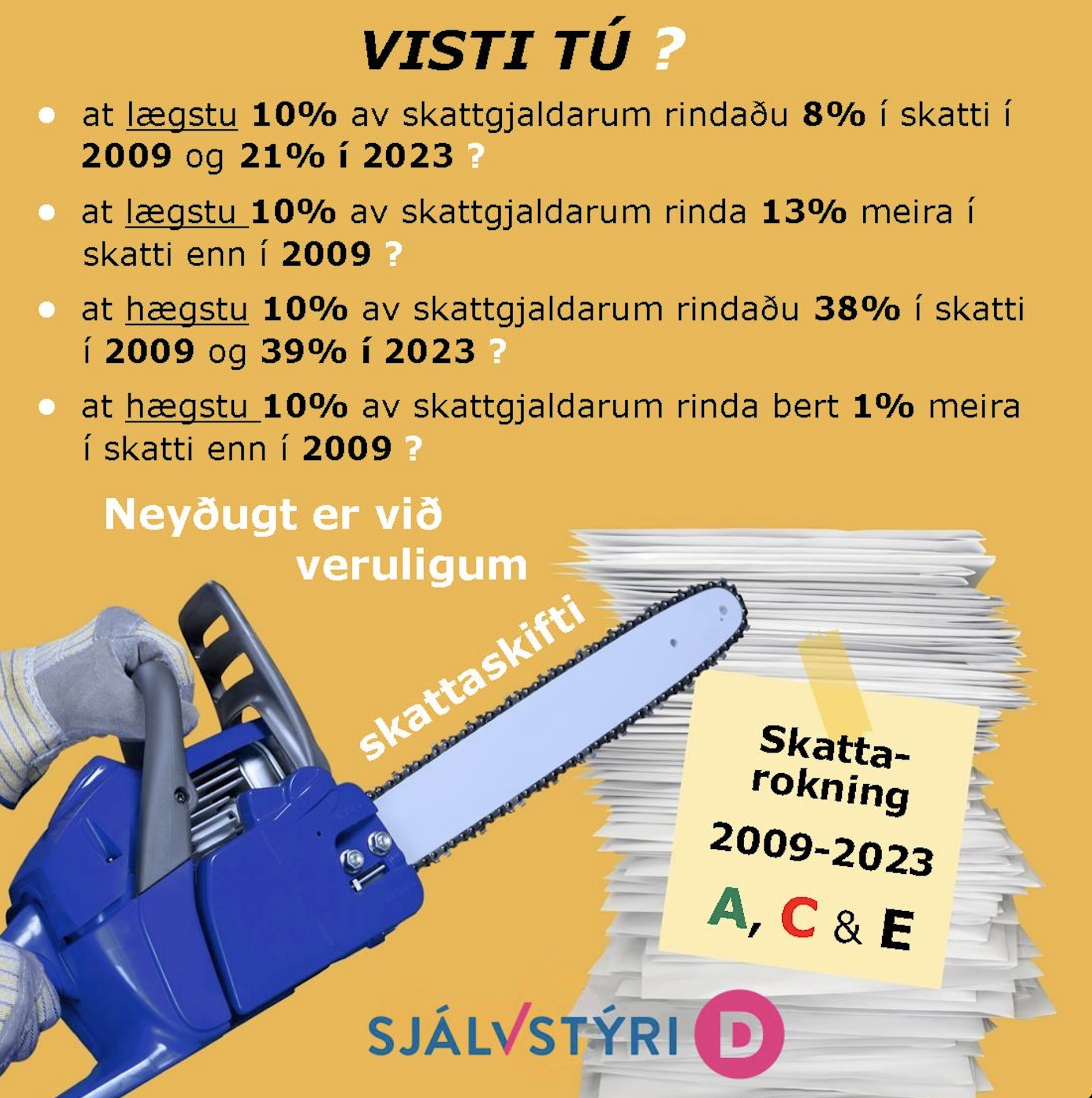 Sjálvstýri fer at arbeiða fyri at rætta upp á tað skattaskifti, sum er hent í Føroyum seinastu árini. Seinastu árini er skattabyrðan nemliga flutt frá teimum, sum hava mest, til tey, ið hava minst.