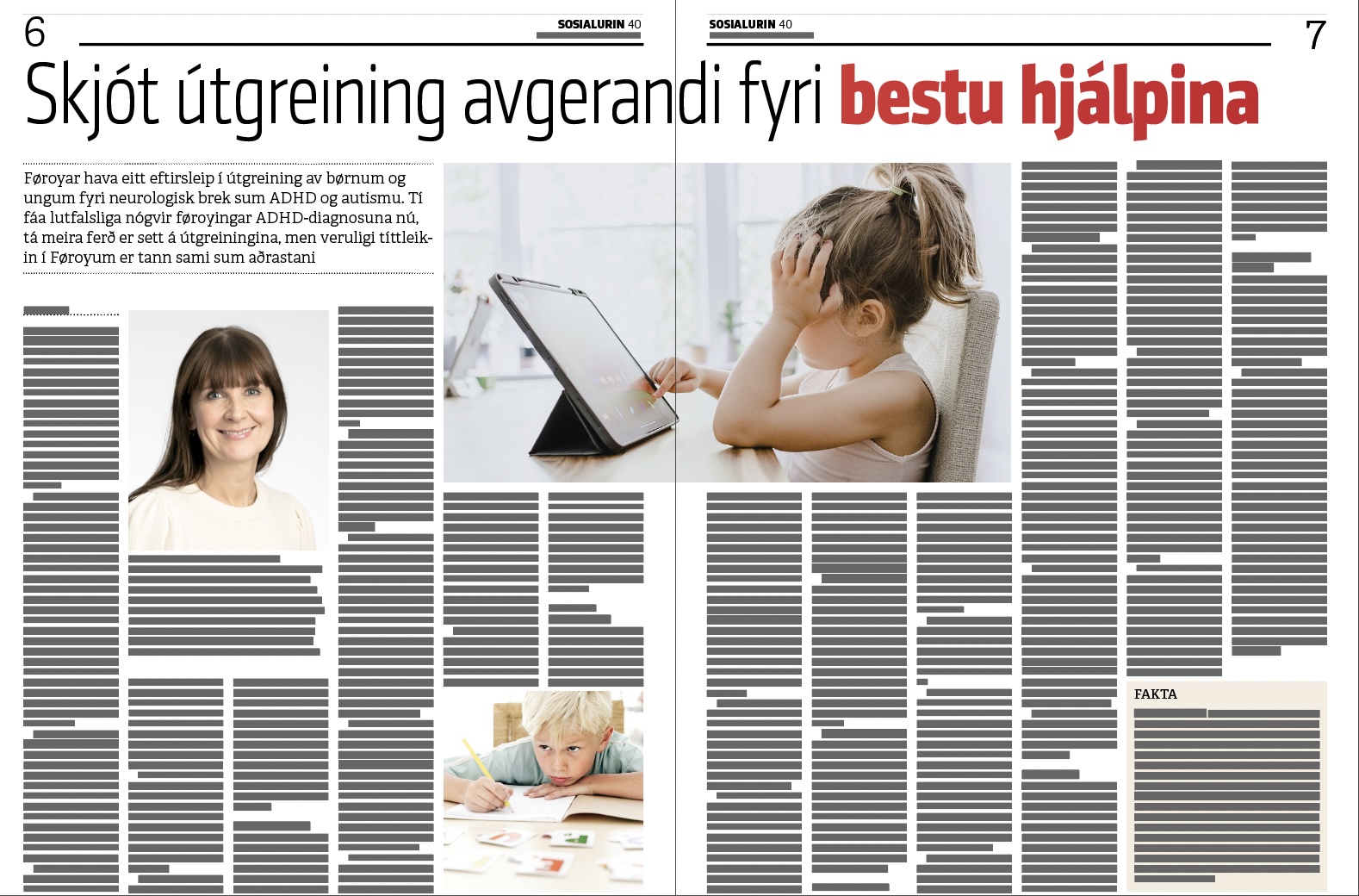 - Ein barnakanning – nakrar serligar royndir – kann geva eina góða ábending um, hvørt eitt barn hevur neurologisk eyðkenni sum til dømis ADHD og autismu, og tí hevði tað verið ein vinn-vinn støða fyri bæði tey børnini, ið eru rakt, teirra familjur og alt samfelagið, um ein slík kanning verður sett í verk sum ein fastur partur av heilsukanningunum, sum vit annars bjóða barnafamiljunum. Og eisini, at nóg mikið av ressursum verða settar av til barnapsykiatriska økið, tí skjót hjálp er góð hjálp og lykilin til bestu menningina og trivnaðin hjá teimum, ið bera hesi brek.