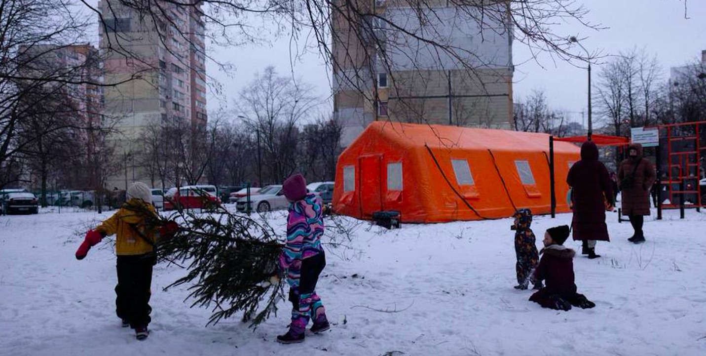 Ukrainsk børn renna úti í kavanum og royna at halda hitanum við at spæla við eitt granntræ. Hetta er kaldasti vetur í Ukraina í eini 20 ár, sí kuldastigini í Kyiv niðast í hesi grein