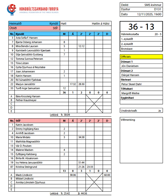 HER ber til frá HSF at síggja dómaraseðlarnir frá dystunum, ið vóru leiktir í SMS-deildini í kvøld: