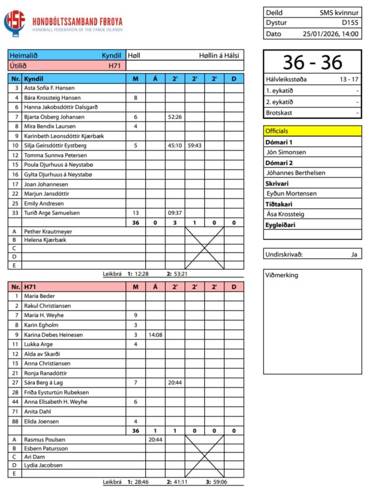 Í høllini á Hálsi í Havn endaði oddauppgerðin millum Kyndil og H71 við javnleiki 36-36. Tá 35 sekund vóru eftir av dystinum skoraði Turið Arge Samuelsen til støðuna 36-34 til Kyndil. Men H71 bara skjótt at. Maria H. Weyhe skoraði fyrst til 36-35, og í allarseinasta sekundinum javnaði Sára Berg á Lag til endaligu støðuna 36-36.