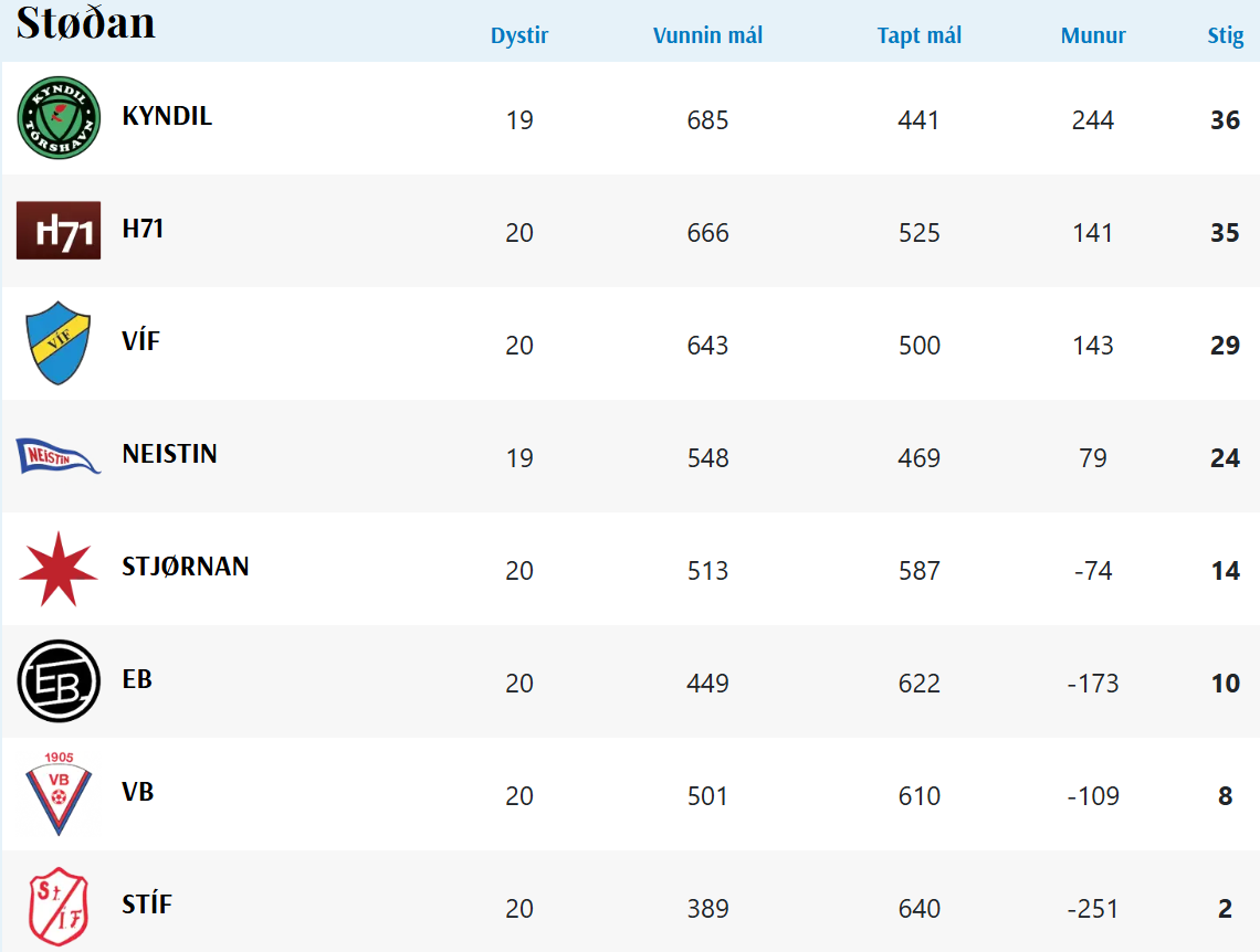 HER ber til frá HSF at síggja dómaraseðilini frá dystinum millum H71 og Stjørnuna, umframt støðuna í deildini: