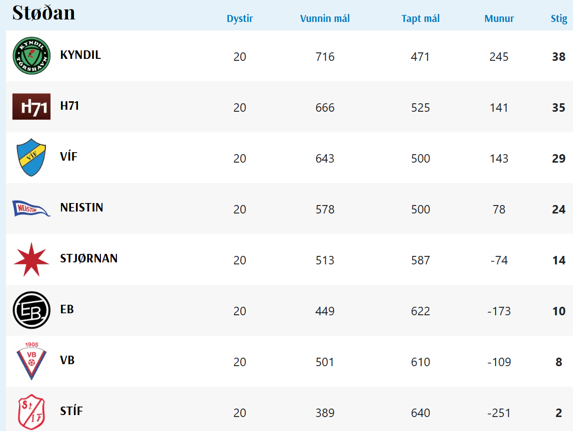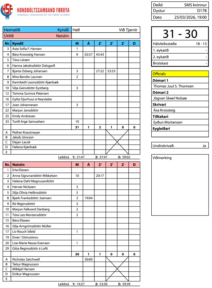 HER ber til frá HSF at síggja dómaraseðilin frá dystinum millum Kyndil og Neistan, umframt støðuna í deildini: