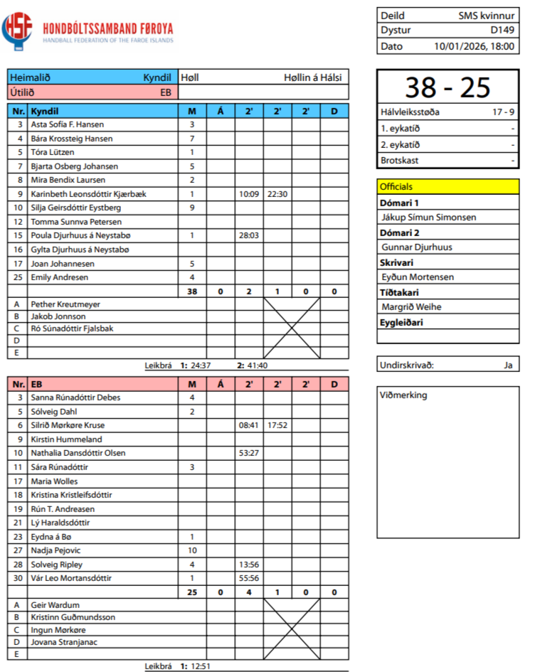 HER ber til at síggja dómaraseðilin frá dystinum millum Kyndil og EB, umframt støðuna í deildini: