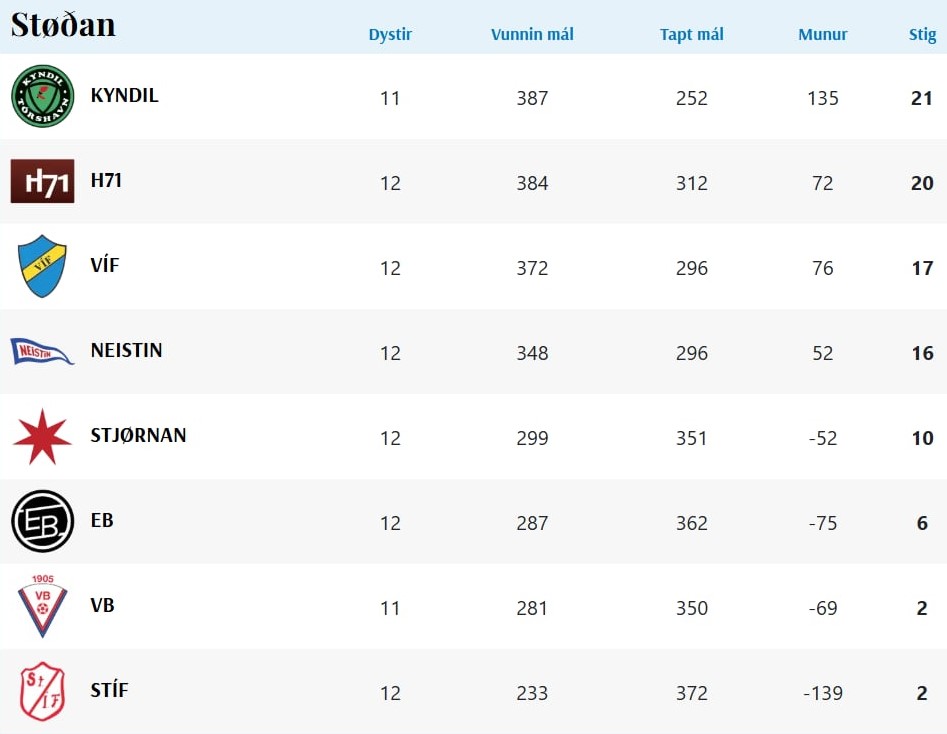 HER ber til frá HSF at síggja dómaraseðilin frá dystinum í Vági, og støðuna í deildini: