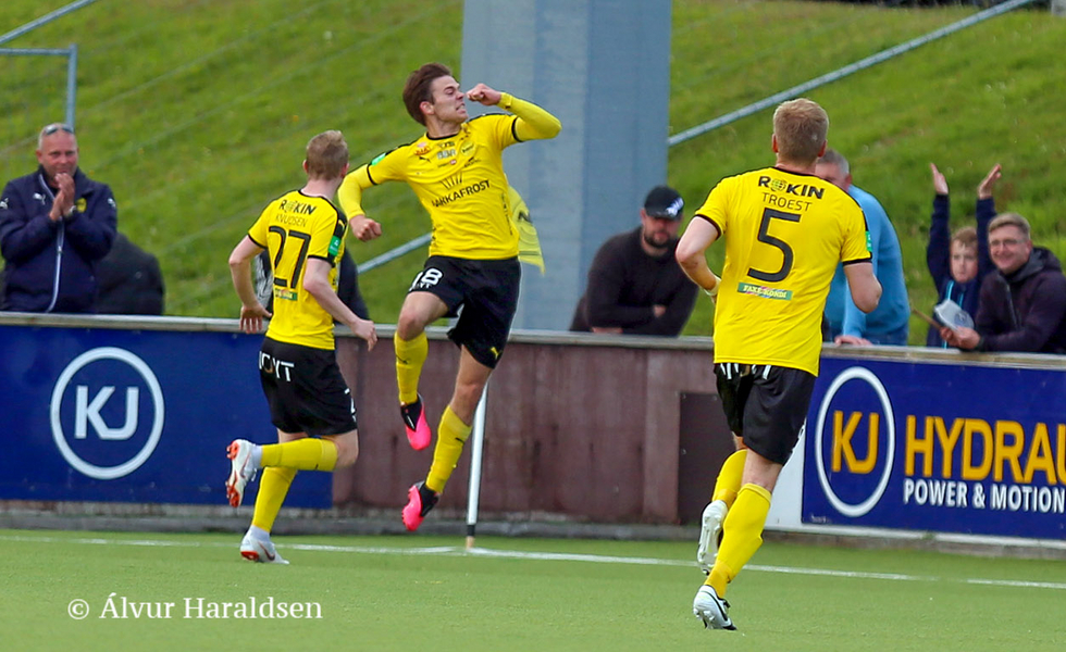 Hálvleiksstøðan var 1-0 til NSÍ. Málið skoraði norski álopsspælarin Tobias Hestad í 25. minutti, og uppleggið átti Jógvan Højgaard. Tobias hevur higartil í ár bara einaferð verið á besta liðnum, har hann einki mál hevur skorað. Í dag skoraði hann fyri aðru ferð í næstbestu deildini.