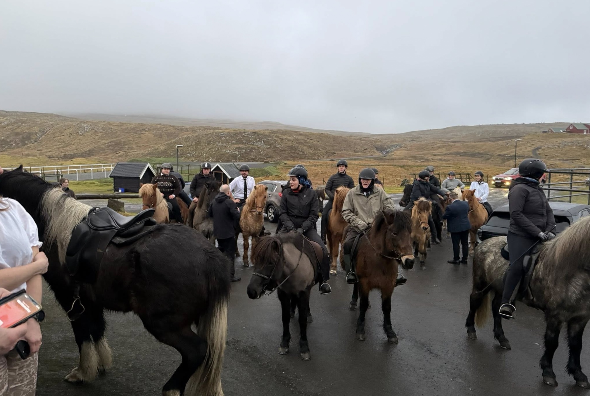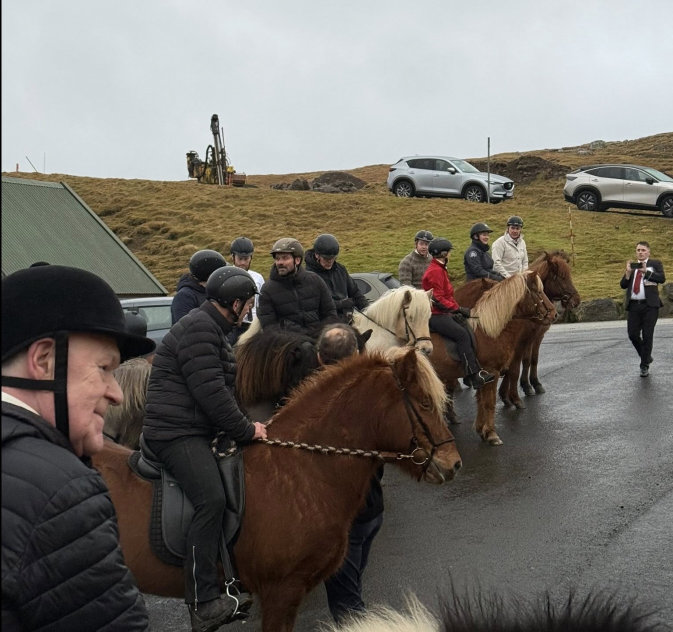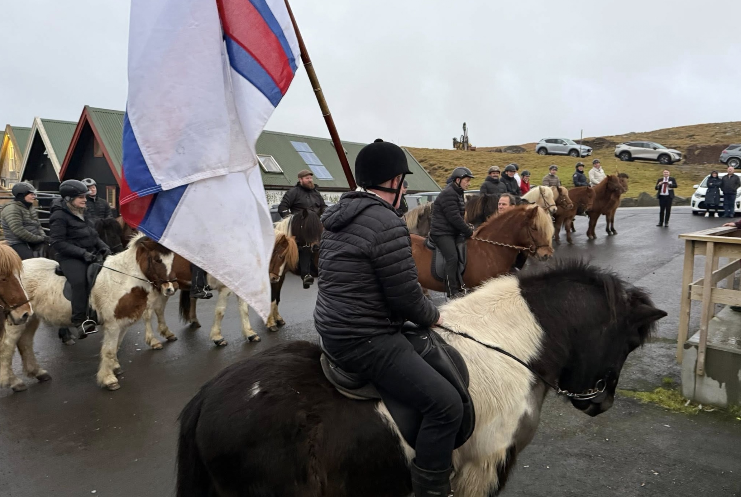 Ríðumenn og kvinnur, eini 50 í tali, skipaðu fyri ríðugongu fyri Svenning, sum tók í móti við heilsan og sungi var fyri honum, til lukku til tín.