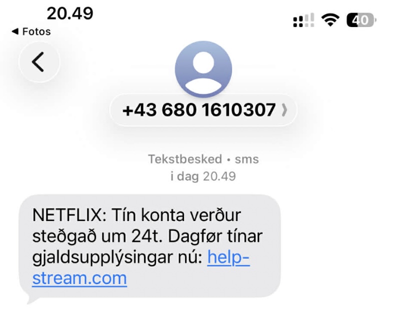 Í gjar fekk løgreglan tvær fráboðanir frá tveimum ymsum persónu um, at tey høvdu fingið sms, sum segði seg vera frá Netflix. Avsendarin var eitt nummar úr Sveis. Viðkomandi sum ringdi, høvdu ikki trýst á leinkjuna, annar teirra hevði als ikki hald frá Netflix, men vildi bara siga løgregluni frá.