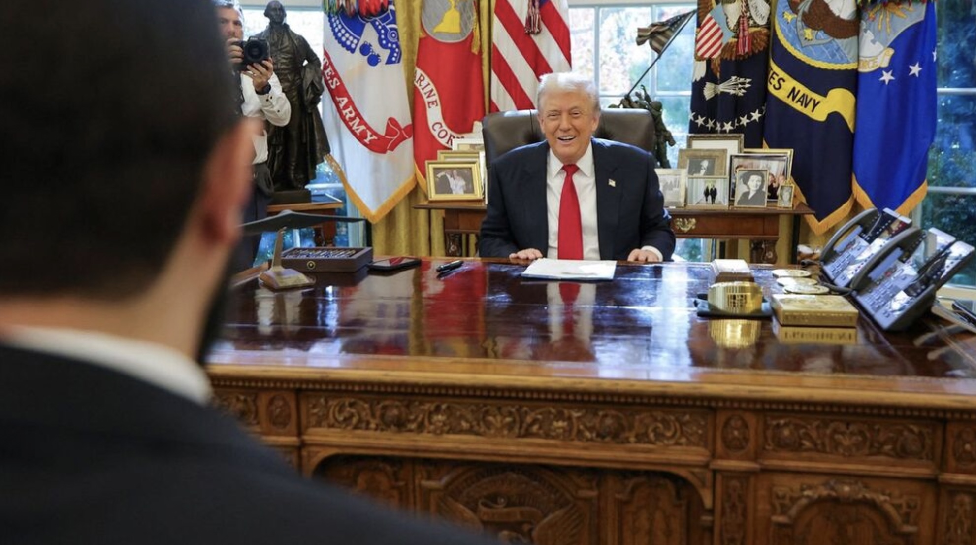 Í staðin fyri at koma gjøgnum høvuðsinngongdina, har myndatól eru og har leiðarar ofta síggjast taka í hondina á Trump, áðrenn teir koma inn, kom al-Sharaa inn gjøgnum eina síðuinngongd, skrivar Reuters.