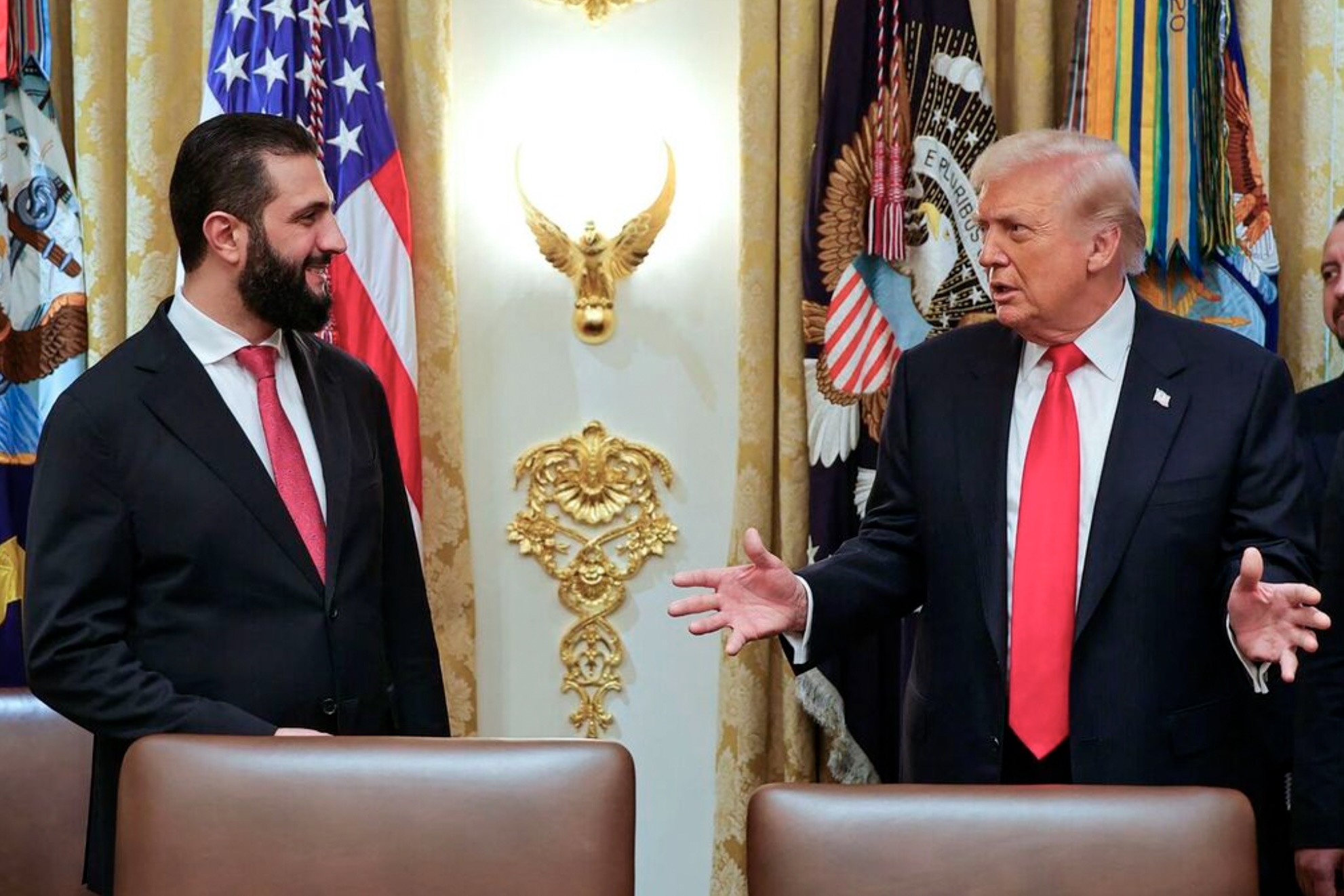 Fleiri myndir eru viðheftar uppslagnum. Millum teirra er ein av Trump og al-Sharaa, sum rætta hond í ovalu skrivstovuni.