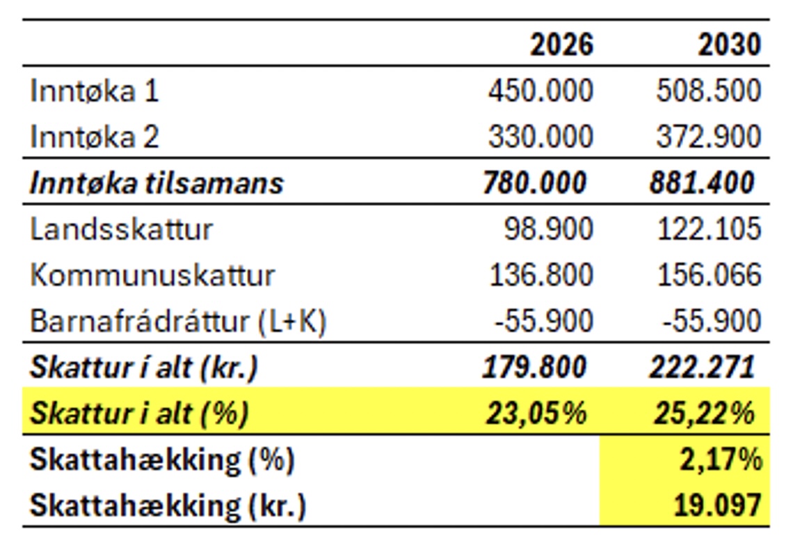 Also: um hækkingin í inntøkuni verður óbroytt, og skattasatsir ikki verða hækkaðir samsvarandi, so fer skattatrýstið hjá hesari familjuni at hækka 2,17 %-stig svarandi til 19.097 kr. í 2030.