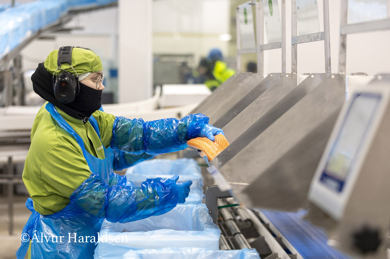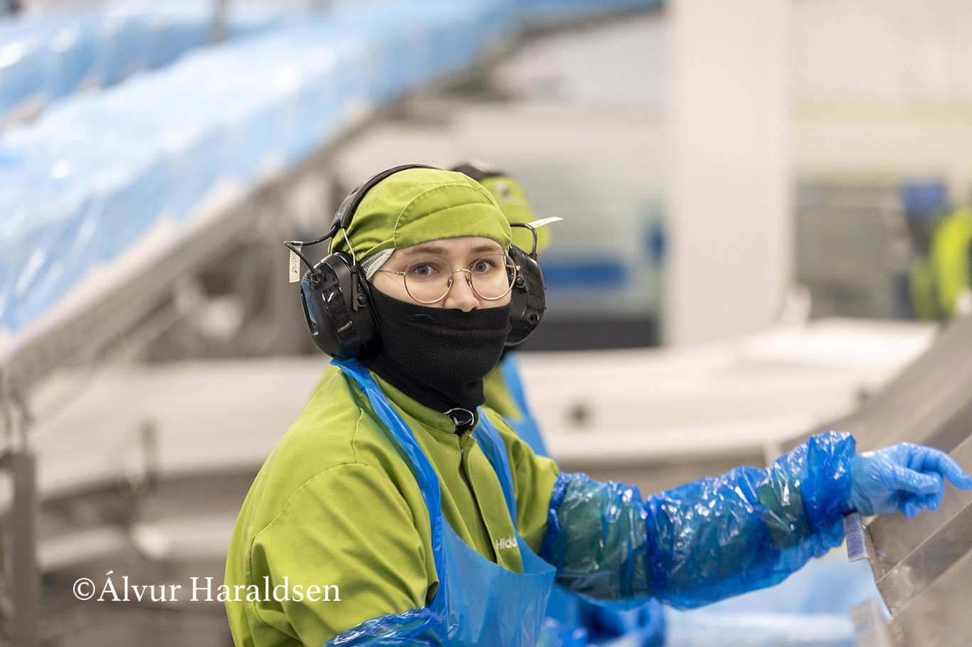 Guðrið Falkvard Joensen hevur arbeitt á laksavirkinum hjá Hiddenfjord í næstan trý ár. Hon arbeiðir við pakking. Laksurin verður býttir upp í stødd, og síðani koyrdur til prentaran. Tá tann sum arbeiðir fast í prenaranum fer í steðg, loysir Guðrið av. Í prentaranum vera eskjurnar vigaðar, og stødd, vekt, og nøgd verður prenta út. Síðani fara eskjurnar til avskiping. Mangla fólk arbeiðir Guðrið eisini í vakum, og onkuntíð sker hon, men allar oftast stendur hon við pakkibandið.