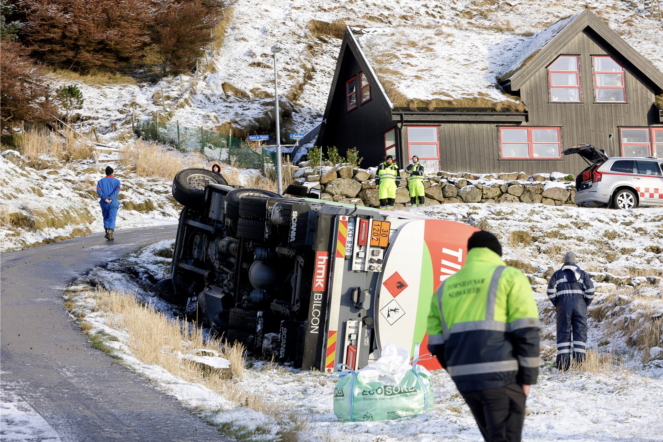 – Har var so mikið hált, at tangabilurin fór á glið út av vegnum og endaði á liðini. Men har var eingin fólkaskaði.