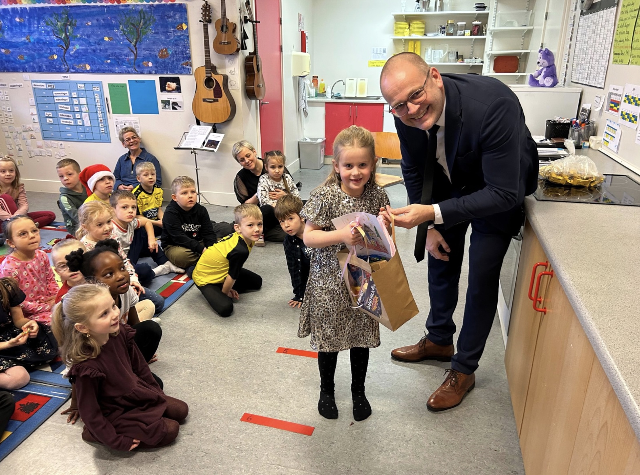 Landsstýrismaðurin hevur verið á vitjan á Glyvra skúla fyri at takka Margit fyri tekningina og geva henni eina lítla gávu afturfyri. Tað var ein sera hugnalig løta, har øll forskúlabørnini sungu ein jólasang.