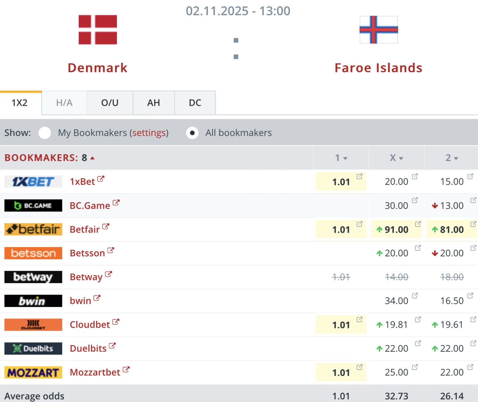Oddsini fyri føroyskan sigur eru sera høg. Tey liggja millum 13,00 og 81,00.
