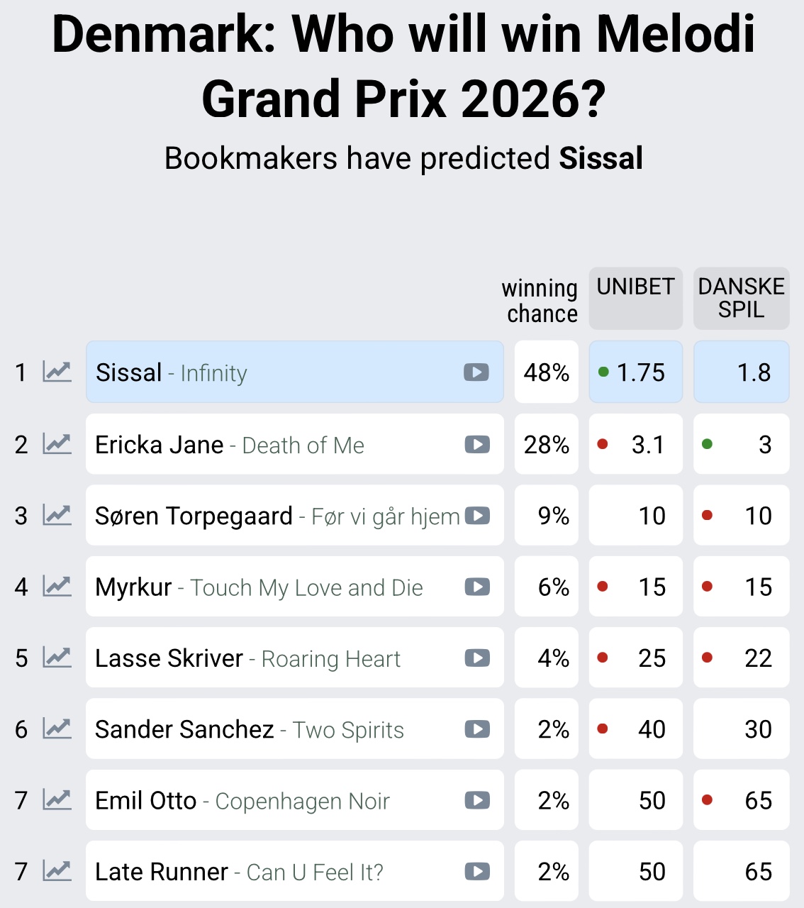 Sambært Danske Spil og Unibet eru møguleikarnir góðir fyri, at Sissal vinnur. Vinnaramøguleikarnir eru 48 prosent. Tað er satt at siga bara Ericka Jane við sanginum "Death of me", ið kann kappast við Sissal. Vinnaramøguleikarnir hjá Ericku Jane, ið sæst á myndini saman við Sissal eru 28 prosent.