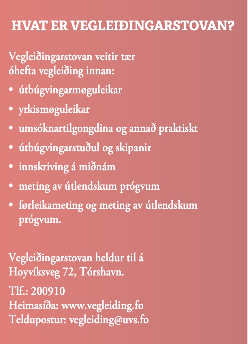 – Men so eru tað onnur, sum hava tørv á antin vegleiðing í at velja útbúgving ella hvussu mann søkir inn á útbúgvingar, kunning um útbúgvingar í øðrum londum ella ynski til eitt komandi arbeiðslív. Á Vegleiðingarstovuni verður skipað fyri bókavegleiðing um um útbúgvingarmøguleikar, útbúgvingarval, skiftislestur og sabbatár.