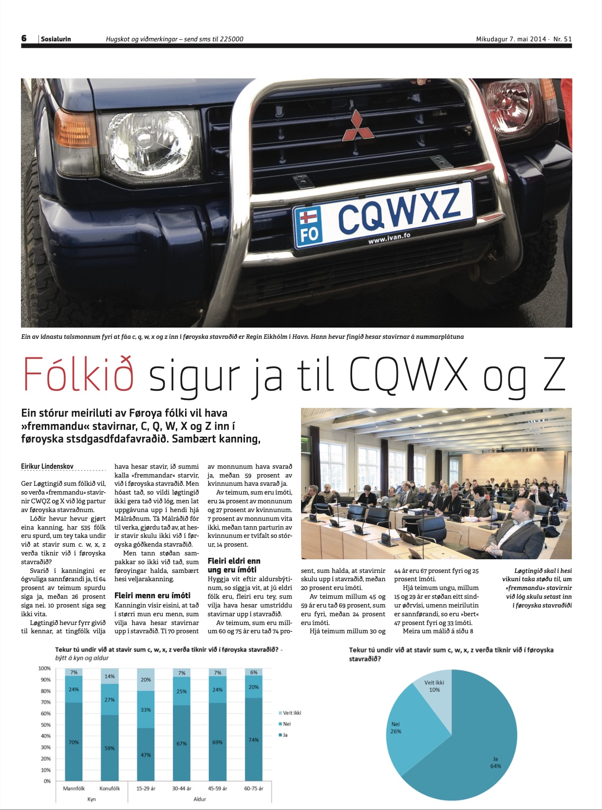 móðurmálsstavraðnum, meðan bara umleið 30% stuðla tí skerda stavraðnum (kanningin endurgivin í greinini “Fólkið sigur ja til CQWX og Z” í Sosialinum 7. mai 2014).
