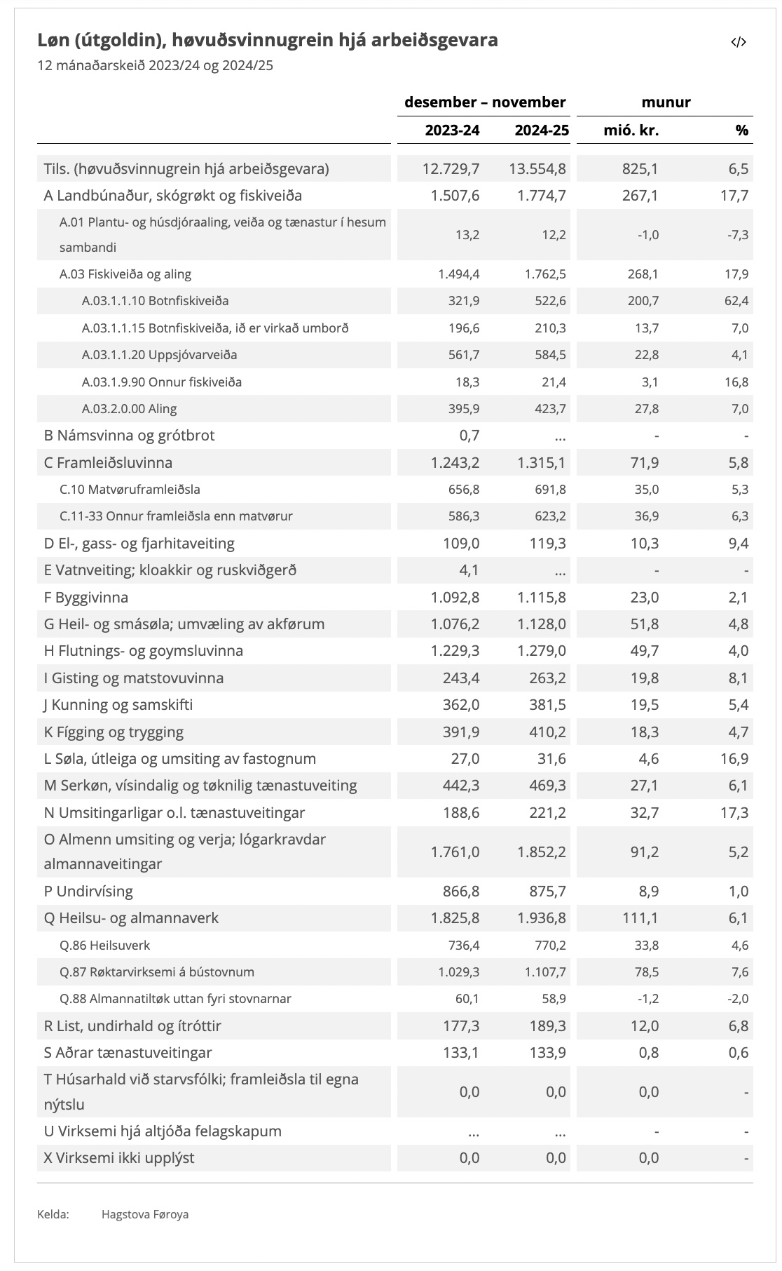 825 milliónir krónur, ella 6,5 prosent, fleiri lønarkrónur vórðu útgoldnar í tíðarskeiðinum frá desember 2024 til november 2025 samanborið við undanfarnu 12 mánaðirnar.