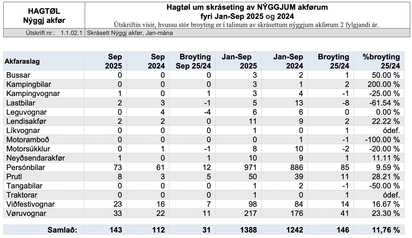 Taka vit bara september í ár í mun til september í fjør, so eru í ár seld 143 nýggj akfør í september í ár í mun til 112 í september í fjør. Tað er ein vøkstur upp á 27 prosent.
