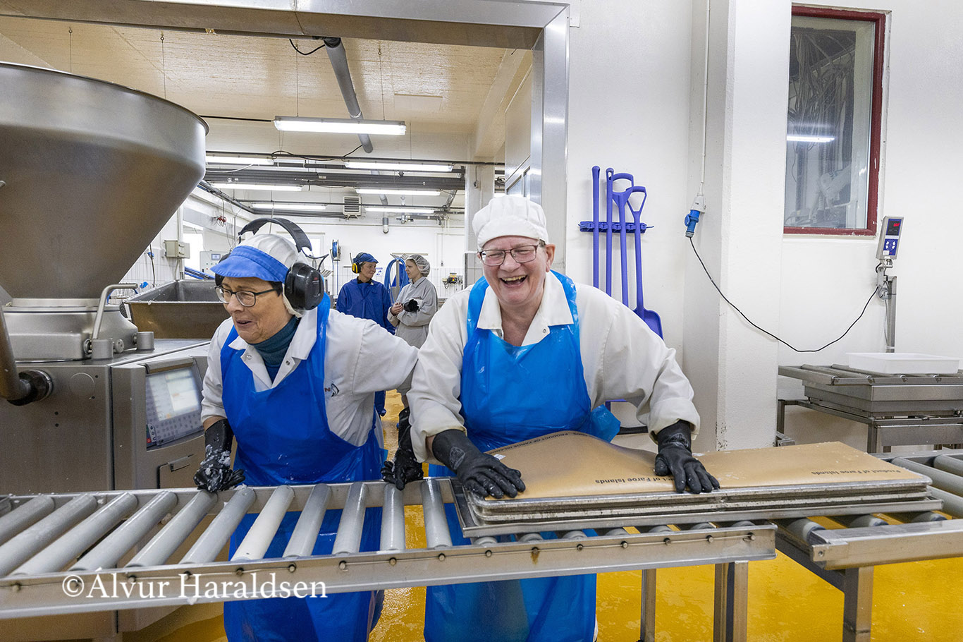 Síðani hon byrjaði, hevur Henny Olsen staðið við pakkibandið. Tær eru seks í pakkitoyminum. Ein lyftir pannurnar á pakkibandið, og ein tekur tær av aftur. Við pakkibandið eru fýra uppgávur, fyrst verður pakkitilfarið sett í stálrammuna, farsið verður vigað, síðani verður tað slættað, og til seinast verður lok koyrt á. Síðani verður pannan lyft á vognin. Tað er pláss fyri 28 pannum á vogninum. Tá vognurin er fullur, verður roterað, soleiðis at tær skiftast um tær fýra uppgávurnar á pakkibandinum.