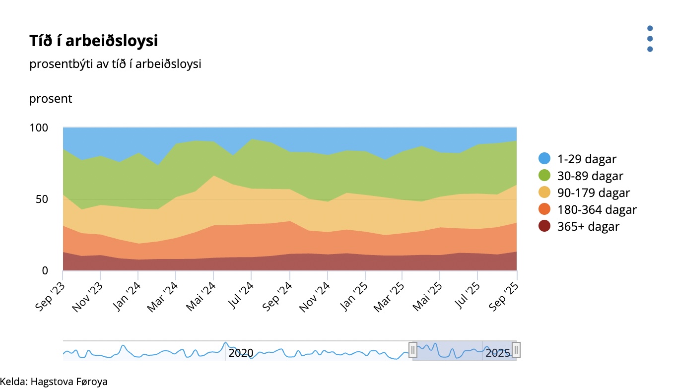 Myndin niðanfyri vísir, hvussu leingi fólk hava verið rakt av arbeiðsloysi. Størsti bólkur, 31 prosent ella 87 persónar, av teimum arbeiðsleysu í september høvdu verið arbeiðsleys millum 30 til 89 dagar.