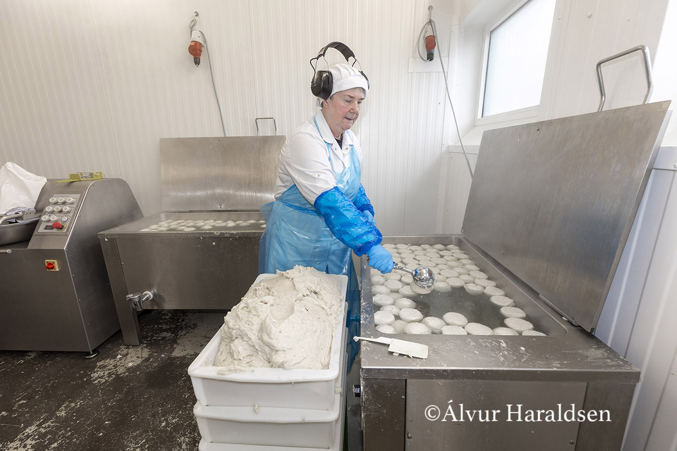 Tað tekur umleið tríggjar tímar at virka ráðfiskin til frikadellur, og tey klára at framleiða áleið 20.000 - 25.000 frikadellur í ein dag.