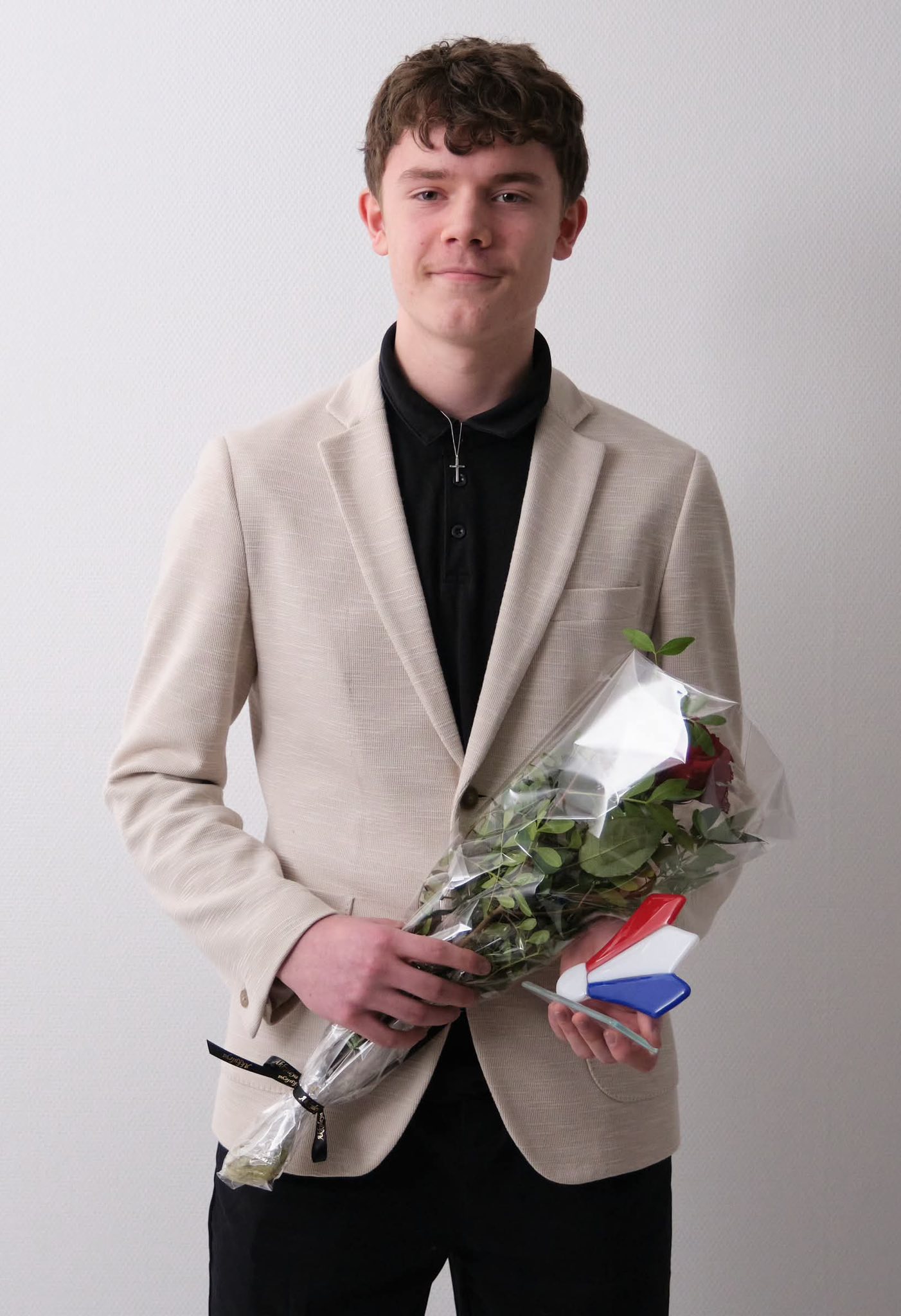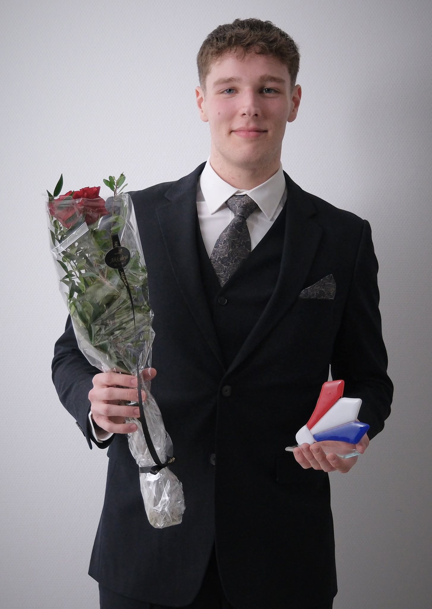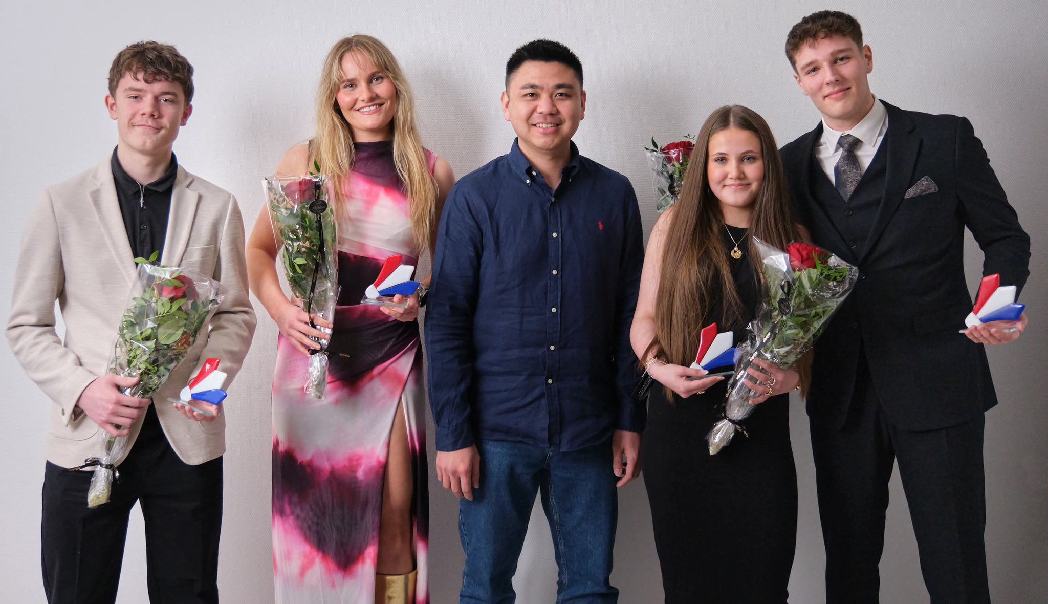 Heiðraðu leikararnir fingu rósur og serstakt minnissteyp handa frá landsliðsvenjaranum.