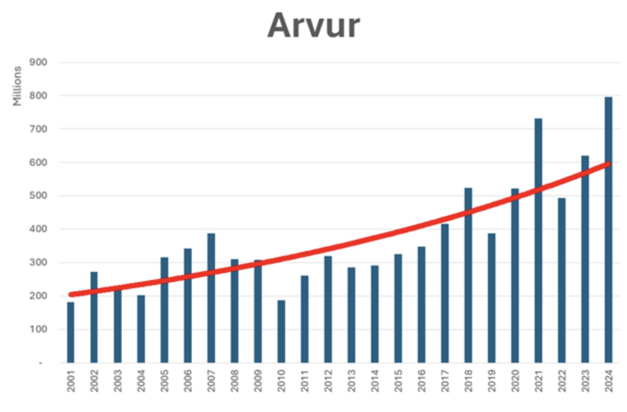 Frá 2001 til 2024 er prístalsjavnaða arvaavgjaldið meira enn fýrafaldað. Úr uml. 5.5 milliónum krónum til uml. 24 milliónir krónir.