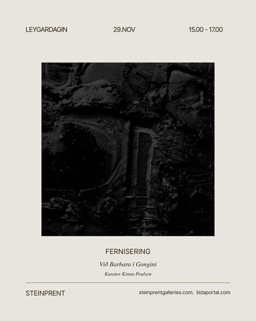 – Vælkomin til vernissage Uppiá í Steinprenti leygardagin 29.november kl.15-17, har høvi verður at heilsa uppá listakvinnuna og at njóta okkurt gott aftur við listini, skrivar Kinna Poulsen, kurator, í sambandi við framsýningina hjá Barbaru í Gongini.