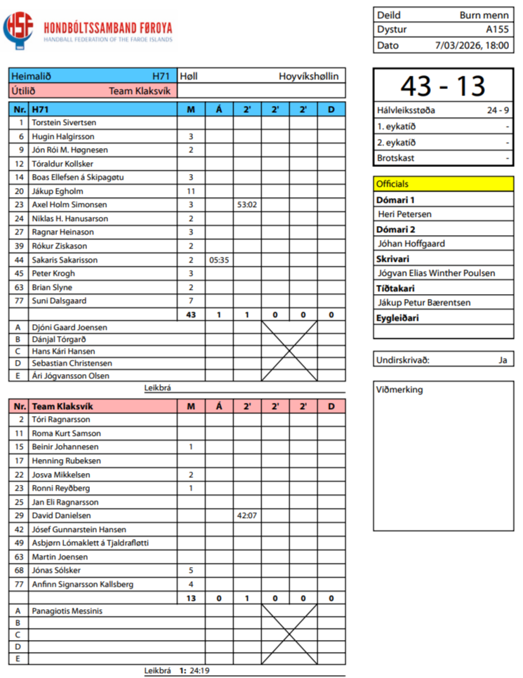 HER ber til frá HSF at síggja dómaraseðilin frá dystinum millum H71 og Team Klaksvík, umframt støðuna í deildini: