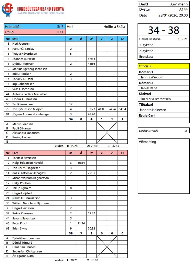 H71 vann í kvøld 38-34 á júst StÍF í høllini á Skála. Tað lá serliga væl fyri í fyrra hálvleiki hjá hoyvíkingum, ið vóru á odda 21-13 í steðginum.