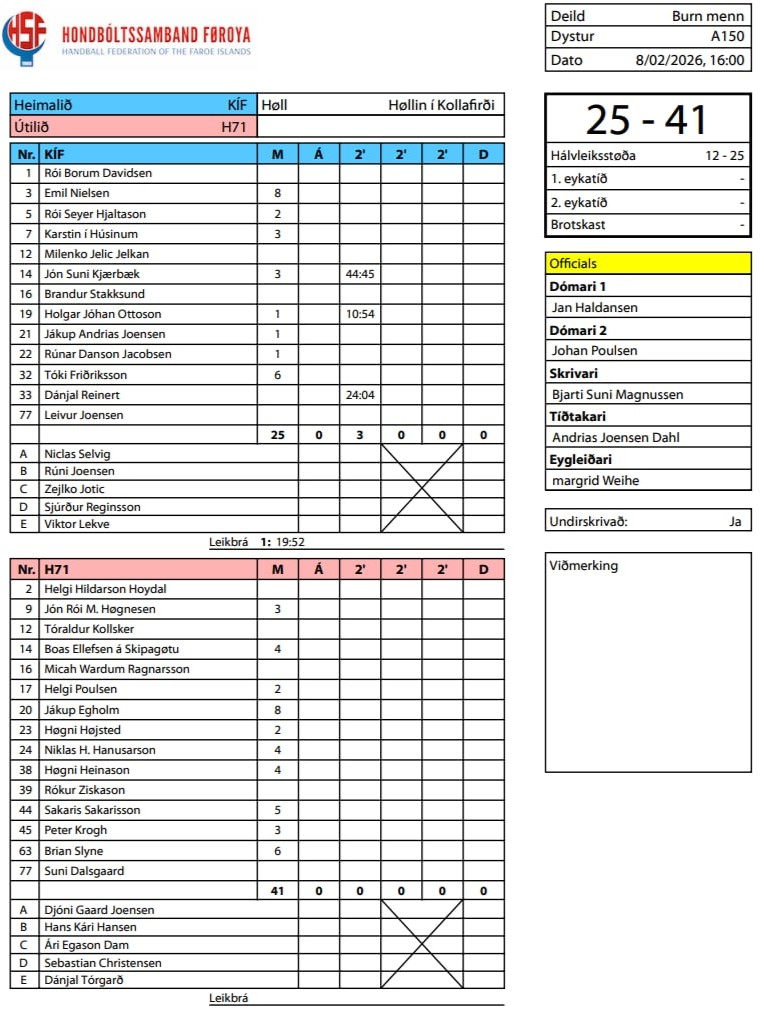 HER ber til frá HSF at síggja dómaraseðlarnar frá dagsins dystum, umframt støðuna:
