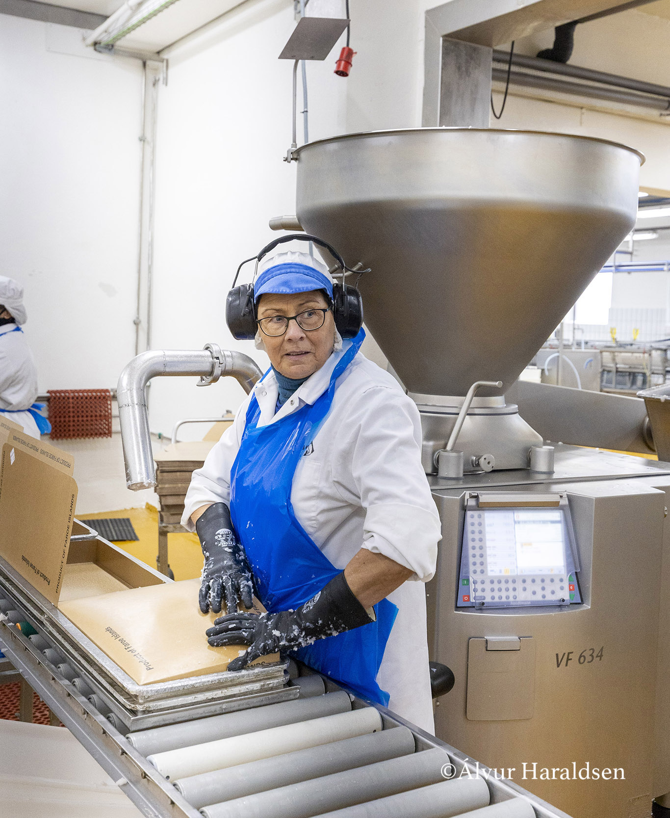 Líka síðani Olea byrjaði á Tavuni hevur hon pakkað. Vanliga eru tey seks sum pakka. Ein lyftur pannurnar á pakkibandið, og ein tekur tær av aftur, tá farsið er komið í. Við pakkibandið eru fýra uppgávur, fyrst verður pakkitilfarið sett í stálrammuna, farsið verður vigað, síðani verður tað slættað, og til seinast verður lok koyrt á. Síðani verður pannan lyft á vognin. Tað er pláss fyri 28 pannum á vogninum. Tá vognurin er fullur, verður roterað, soleiðis at tær skiftast um tær fýra uppgávurnar.