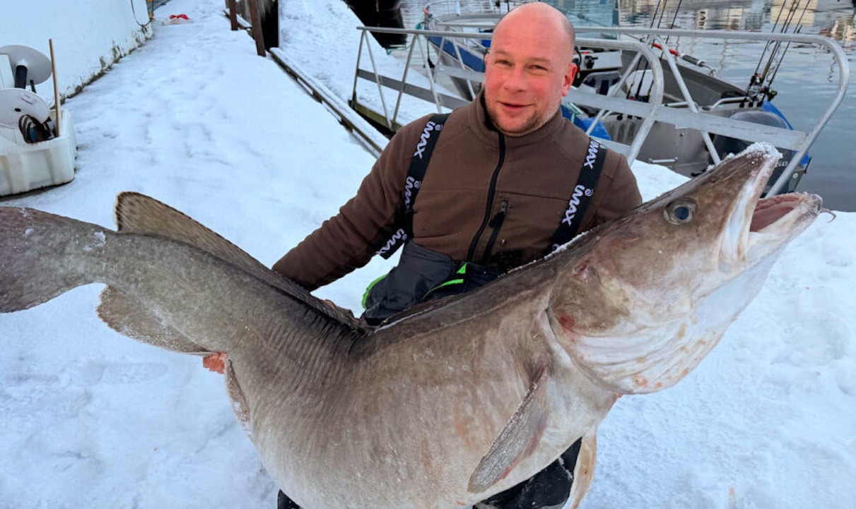 Á myndini stendur týskarin, Daniel Baldzun, við einari risastórari longu, sum er veidd við oynna, Hitra í Norðurnoregi.