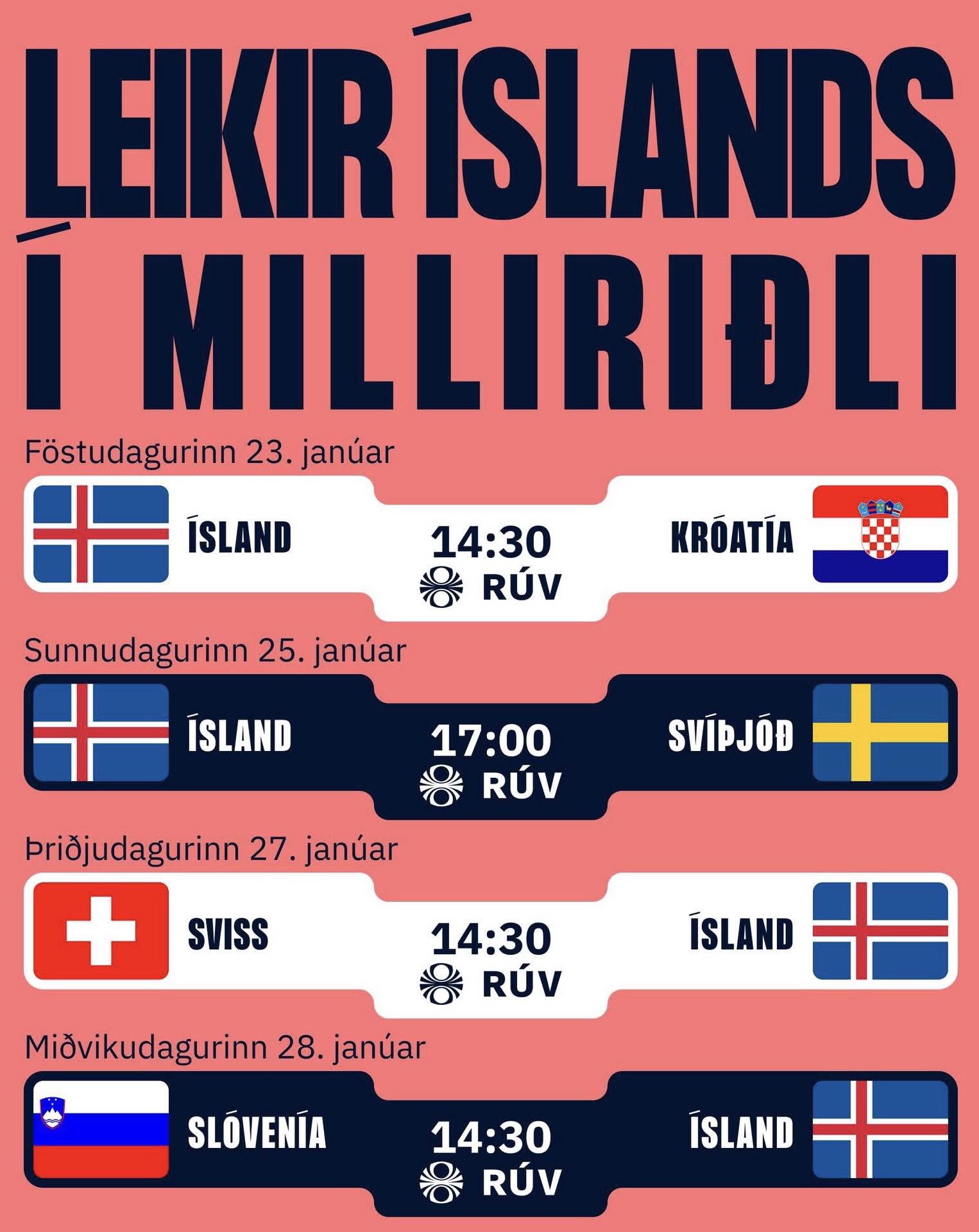 25. januar: Ísland – Svøríki, kl. 17.