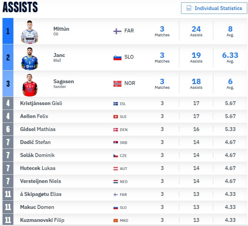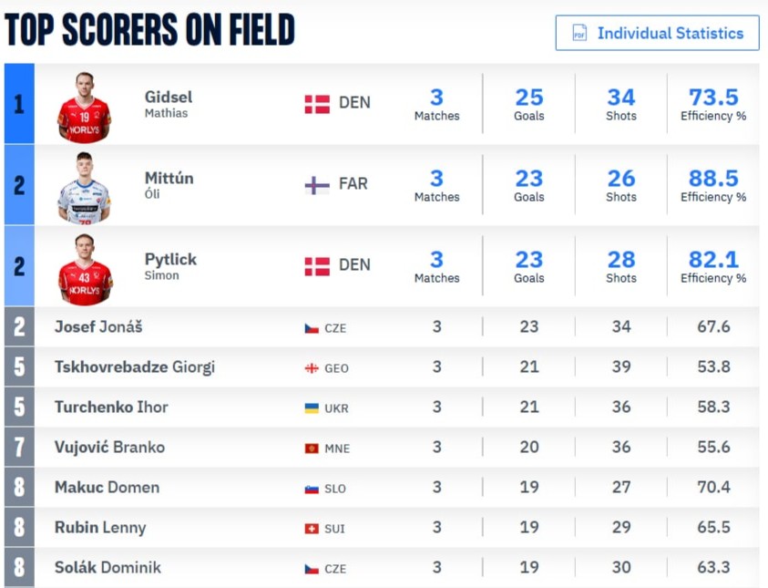 Óli hevur skotið øll síni 23 mál í opnum spæli, og á tí yvirlitinum er hann næstfremst. Bert danski stórleikarin, Mathias Gidsel við 25 málum í opnum spæli liggur hægri enn Óli á tí yvirlitinum.