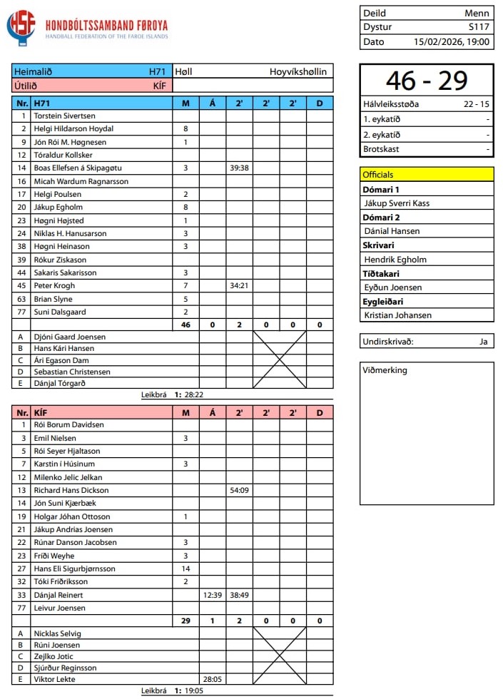 HER ber til frá HSF at síggja dómaraseðilin frá seinnu Faxe Kondi hálvfinaluni millum H71 og KÍF: