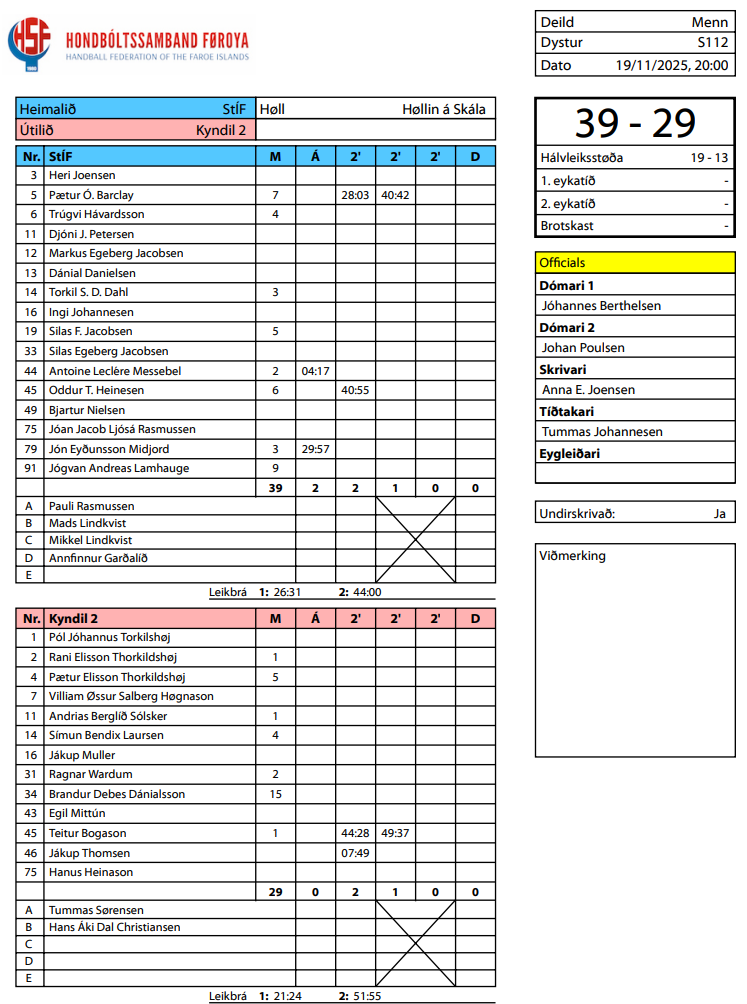 Jógvan Andreas Lamhauge var við níggju málum toppskjútti hjá StÍF. Blaðungi Brandur Debes Dánialsson var stórskjútti hjá Kyndli í kvøld. Hann skoraði 15 mál, also meir enn helvtina av málunum hjá liðnum.