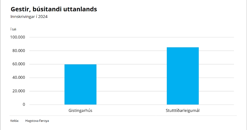 Nærum eins nógvir gestir gistu í stutttíðarleigumálum, eitt nú í sethúsum og íbúðum, sum á gistingarhúsunum í 2024. Hinvegin gistu munandi fleiri av útlendsku gestunum í stutttíðarleigumálunum, hetta skrivar Hagstovan, sum hevur gjørt tølini upp.
