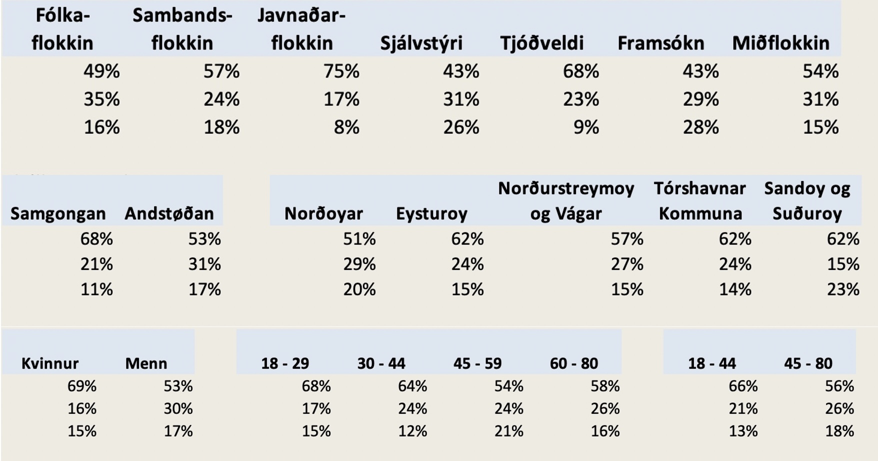 Niðanfyri sæst, hvat veljarar í ymsu flokkunum halda, hvat fólk ymsastaðni í Føroyum halda, og hvat kvinnur og menn og fólk í ymsum aldri halda: