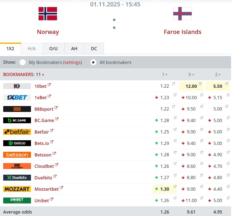 Noreg er í dag, eins og teir vóru 14. januar í 2024 greiður favorittur móti Føroyum hjá altjóða veddingarfyritøkum, ið lata odds upp á dystin.