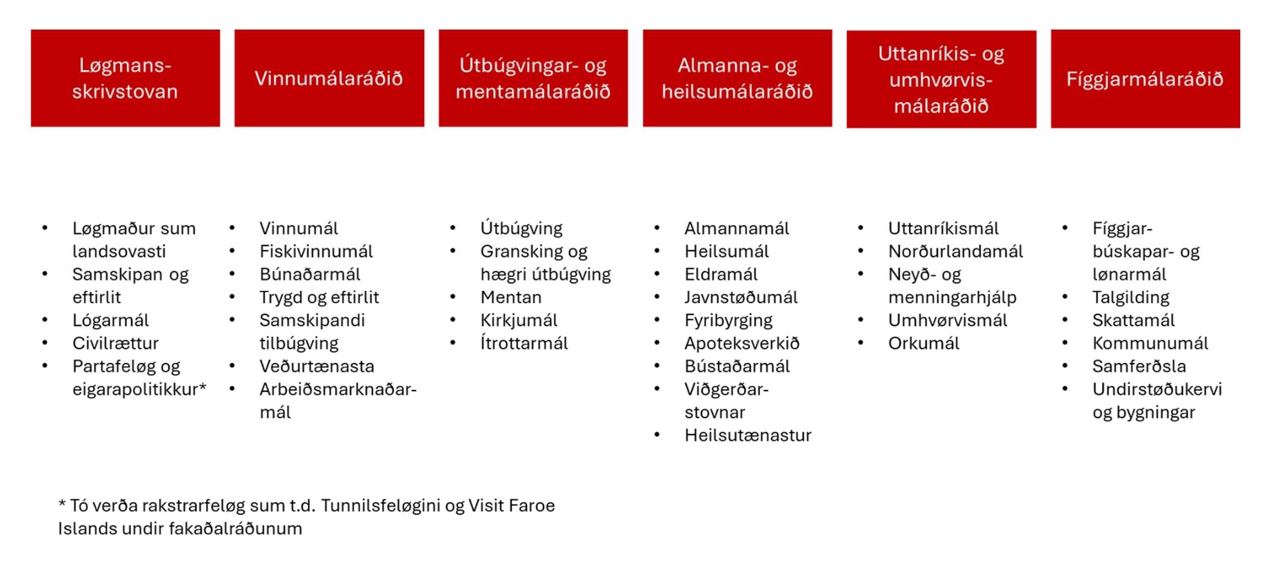 - At lækka talið á aðalráðum úr 9 aðalráðum niður í 6 aðalráð - Løgmansskrivstovan og 5 vanlig aðalráð.