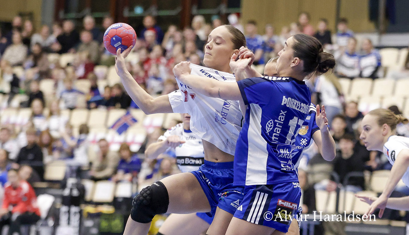 Annika Fríðheim Petersen kom inn fyri Rakul Wardum at verja málið. Og við fimm bjargingum hevur Annika gjørt sítt at steðga bløðingini, ið var miðskeiðis í fyrra hálvleiki, tá Ísland var á odda 13-7.