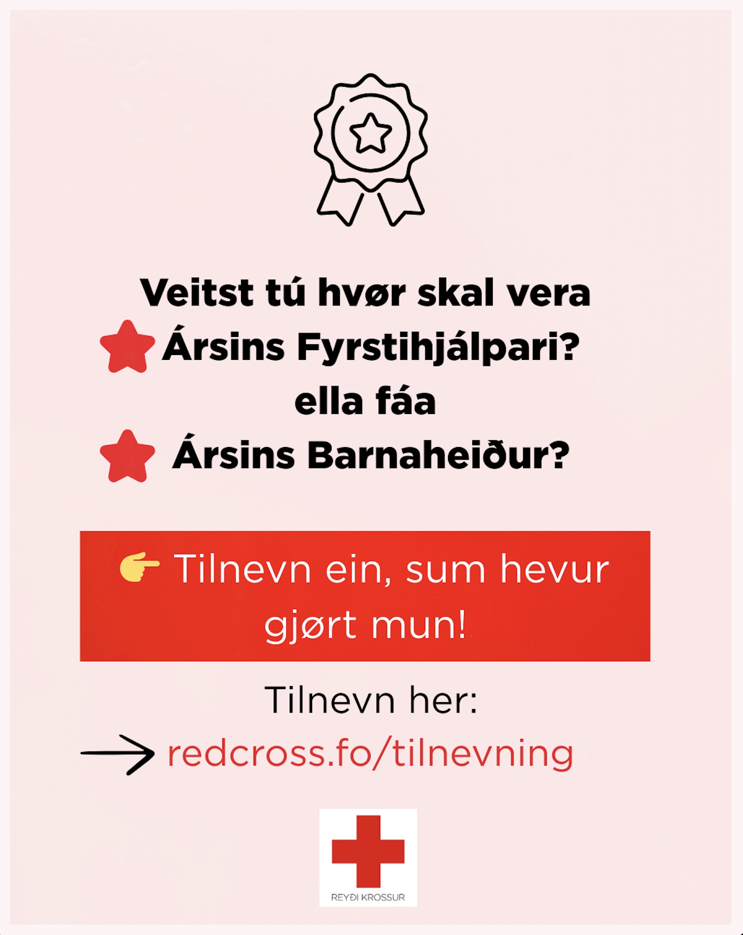 Uppskot kunnu sendast til Reyða kross á frymlinum á heimasíðuni: redcross.fo/tilnevning/, á telduposti: [email protected] ella sum vanligur postur til Stiðjagøtu 6, 100 Tórshavn.