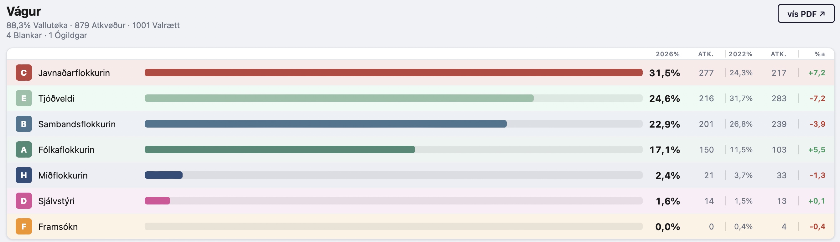 Sambandsflokkurin og Tjóðveldi hava stóra afturgongd í Vági, har Fólkaflokkurin eisini gongur fram til 17,1 prosent.