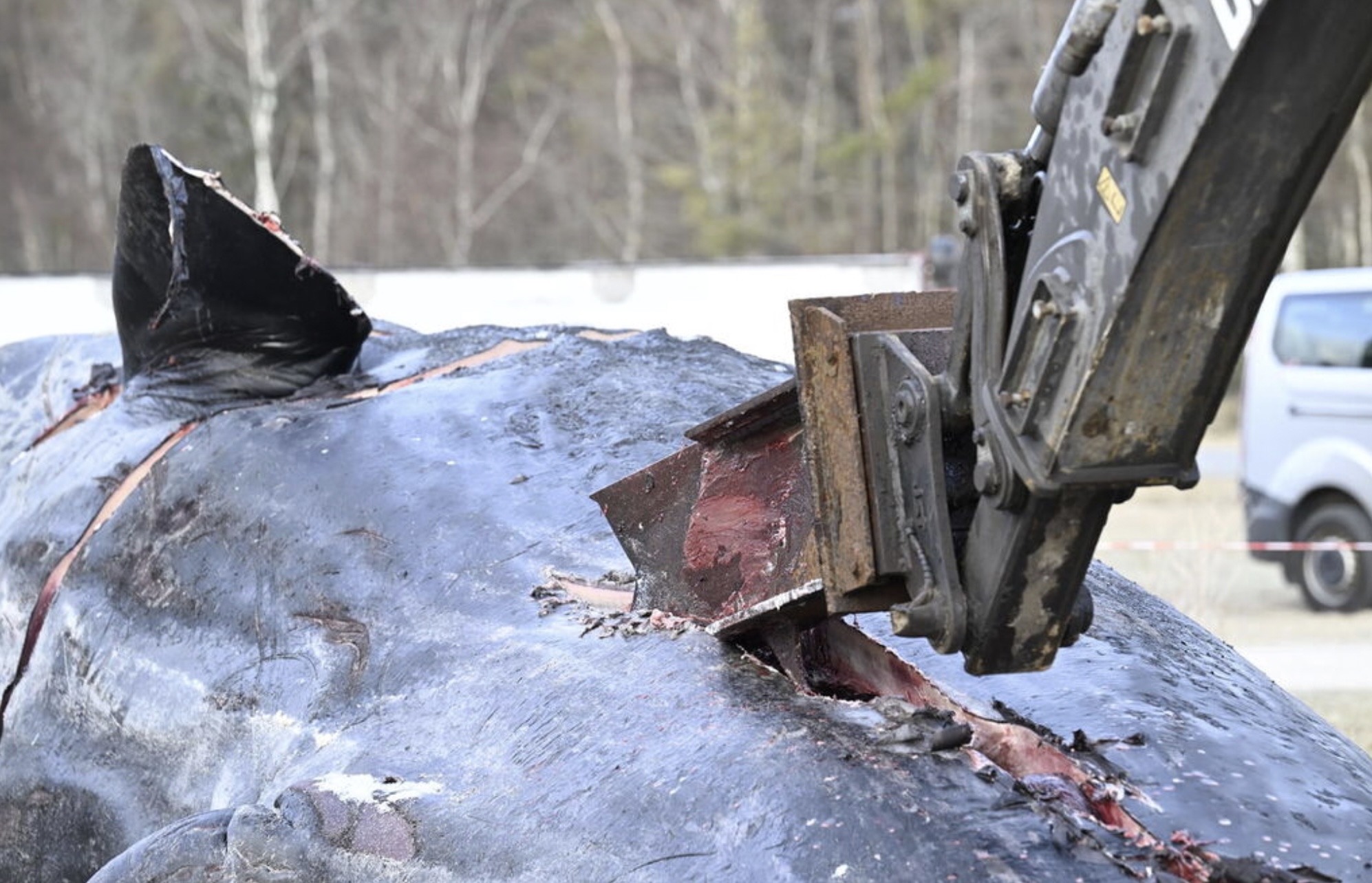 Enn er vandi fyri spreinging, og tí er toymið byrjað við at brúka rennigravara. Hann fer at skera í hvalin og sleppa gassinum fyri at minka um vandan fyri spreinging, sigur Charlotte Bie Pedersen.